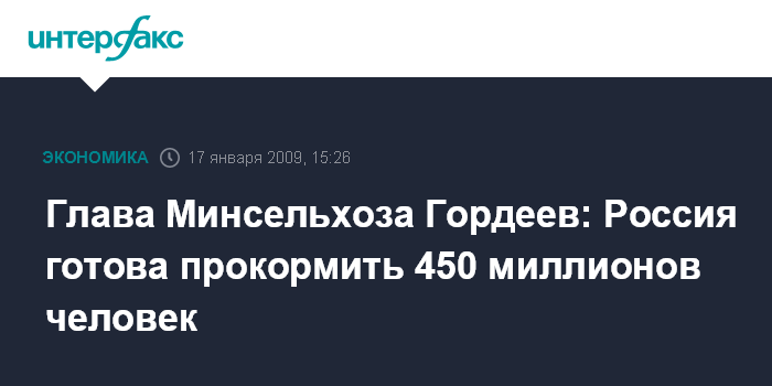 "Мы провели научно-исследовательскую работу, подготовили оценку биоклиматического и природного потенциала страны, которая показала, что в современных условиях Россия готова прокормить 450 млн человек, что в три раза больше, чем ее население", - заявил А.Гордеев на второй международной конференции министров сельского хозяйства РФ на тему "Обеспечение населения мира продовольствием - глобальный вызов для политики и экономики" в субботу в Берлине.