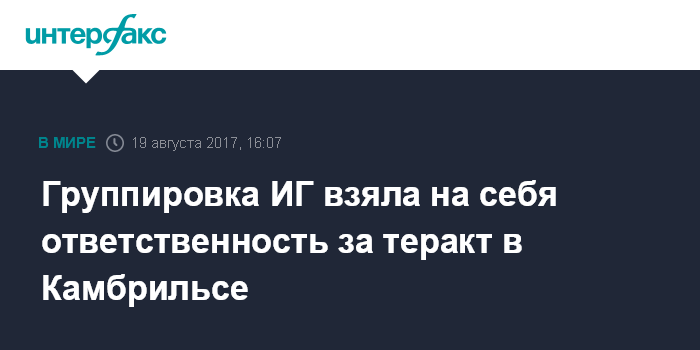 Москва. 19 августа. INTERFAX.RU - Террористическая группировка "Исламское государство" (ИГИЛ, запрещена в РФ) взяла на себя ответственность за теракт в испанском Камбрильсе, сообщает в субботу британское издание The Independent.