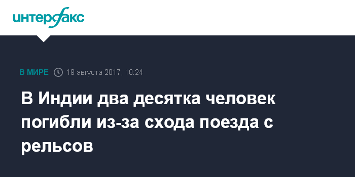 Москва. 19 августа. INTERFAX.RU - По меньшей мере 20 человек погибли и свыше 50 получили ранения в результате схода поезда с рельсов в индийском штате Уттар-Прадеш, сообщает индийский ресурс India Today.