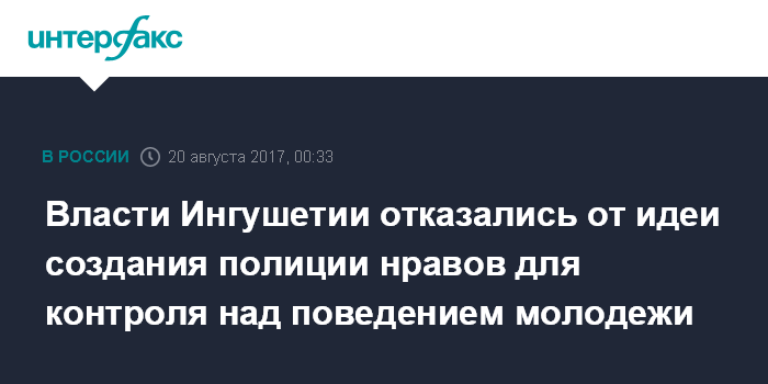 "В ходе традиционной встречи главы Ингушетии с молодежью активисты предложили создать в регионе полицию нравов. Данная структура, по их мнению, могла бы заниматься пресечением преступлений, связанных с нарушением общественной нравственности, регламентировать внешний вид и поведение молодых людей. Евкуров эту инициативу не поддержал", - сказал собеседник агентства.
