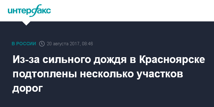 Москва. 20 августа. INTERFAX.RU - Подтопления фиксируются на ряде участков автомобильных дорог в Красноярске из-за сильного проливного дождя, сообщило главное управление МВД России по Красноярскому краю в воскресенье.