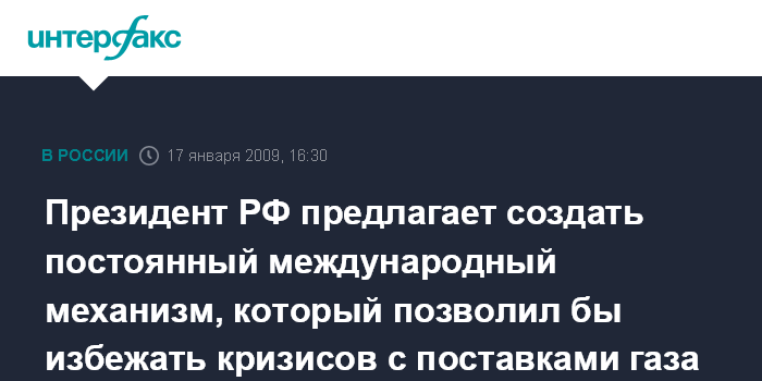 Москва. 17 января. INTERFAX.RU - Президент РФ Дмитрий Медведев предложил создать постоянно действующий международный механизм, который позволил бы избежать в будущем возникновения кризисов с поставками газа.