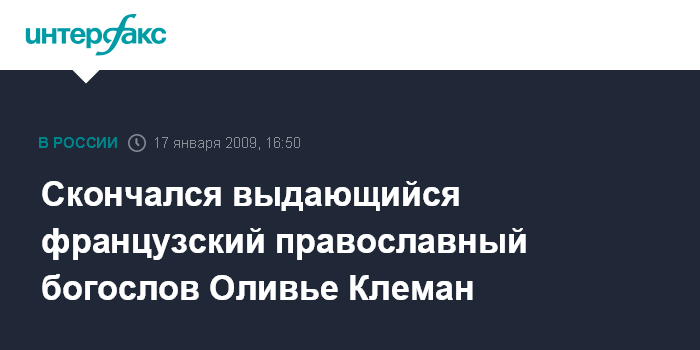 Москва. 17 января. INTERFAX.RU - Вечером 15 января в возрасте 87 лет скончался выдающийся православный богослов Оливье Клеман, сообщили порталу "Интерфакс-Религия" (www.interfax-religion.ru) в субботу в русской православной общине Парижа.