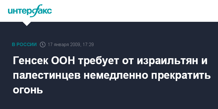 Москва. 17 января. INTERFAX.RU - Генеральный секретарь ООН Пан Ги Мун в очередной раз призвал Израиль и Палестину к немедленному прекращению огня в зоне конфликта.