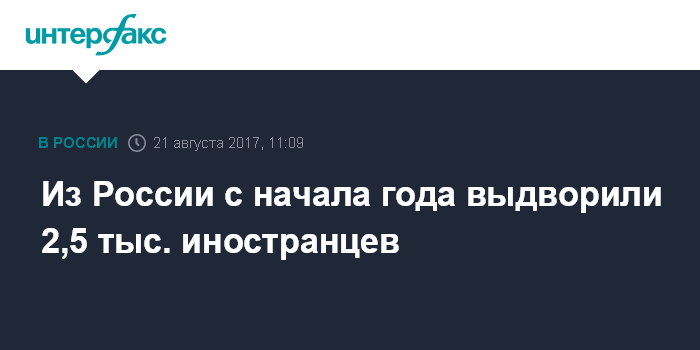 Москва. 21 августа. INTERFAX.RU - Свыше 2,5 тысячи иностранцев депортированы из РФ с начала 2017 года, почти 77 тысячам запрещен въезд в страну, сообщили "Интерфаксу" в понедельник в пресс-центре МВД РФ.