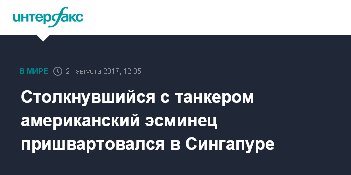 Москва. 21 августа. INTERFAX.RU - Эсминец ВМС США "Джон Маккейн", столкнувшийся с танкером, в понедельник пришвартовался на военной базе в Сингапуре, передает АР.