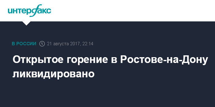 Москва. 21 августа. INTERFAX.RU - Пожарные при поддержке авиации ликвидировали открытое горение в Ростове-на-Дону, сообщил начальник Южного регионального центра МЧС Игорь Одер.