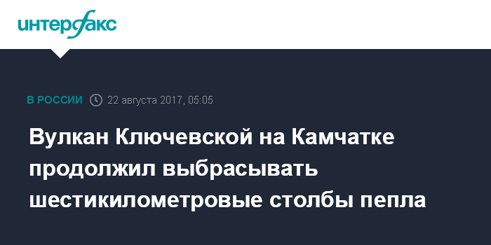 Москва. 22 августа. INTERFAX.RU - Ключевской вулкан продолжает извергаться, непрерывно выбрасывая столбы пепла, который до населенных пунктов не доходит, сообщили во вторник агентству "Интерфакс" в Камчатской группе реагирования на вулканические извержения (KVERT) Института вулканологии и сейсмологии Дальневосточного отделения Российской академии наук (РАН).