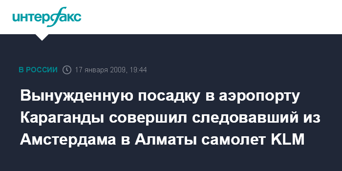 Караганда. 17 января. ИНТЕРФАКС-КАЗАХСТАН - В аэропорту "Сары Арка" Караганды (адмцентр Карагандинской области Казахстана) в субботу совершил вынужденную посадку самолет авиакомпании KLM - Royal dutch airlines, следовавший рейсом KL 409 из Амстердама в Алматы (Алма-Ату). На борту - 120 пассажиров.