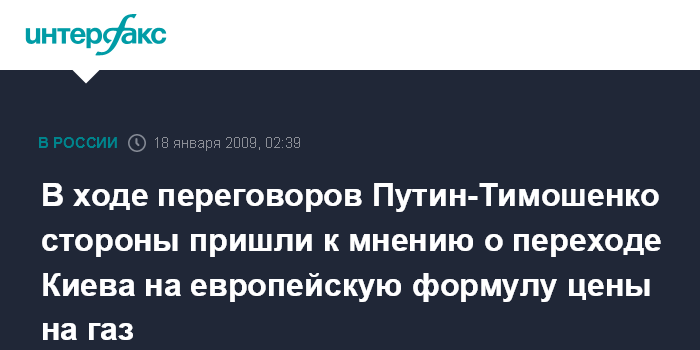 Москва. 18 января. ИНТЕРФАКС - В ходе переговоров между премьерами России и Украины Владимиром Путиным и Юлией Тимошенко удалось договориться о переходе российского газа на европейскую формулу образования цены.