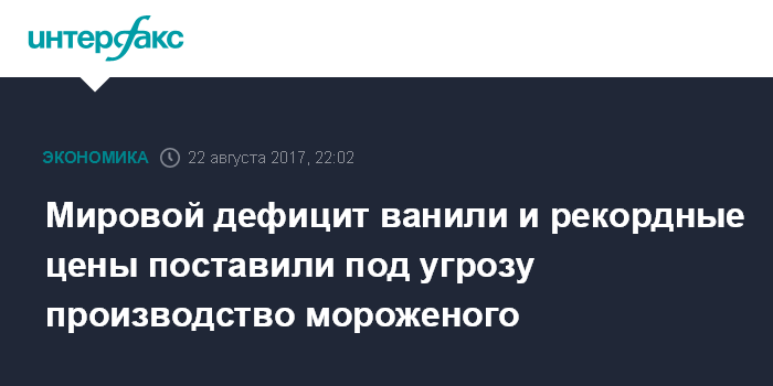 Москва. 22 августа. INTERFAX.RU - Дефицит предложения ванили на мировом рынке вызвал рост цен до рекордных отметок, в десятки раз превышающих уровень, наблюдавшийся несколько лет назад, и поставил под угрозу производство традиционного ванильного мороженого, сообщают британские и американские СМИ.