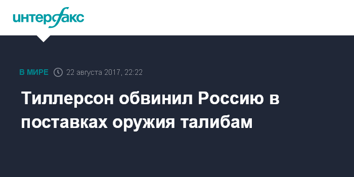 Москва. 22 августа. INTERFAX.RU - Госсекретарь США Рекс Тиллерсон во вторник обвинил Россию в поставках оружия террористам из "Талибана". Тиллерсон сделал такое заявление во вторник в ходе брифинга госдепартамента США. Он напомнил, что такие поставки нарушают нормы международных отношений и Совбеза ООН.