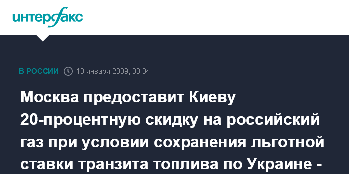 Москва. 18 января. ИНТЕРФАКС - Россия предоставит Украине 20-процентную скидку на поставки российского газа при условии сохранения льготной ставки транзита топлива по территории страны, заявил премьер России Владимир Путин журналистам после переговоров со своей украинской коллегой Юлией Тимошенко.