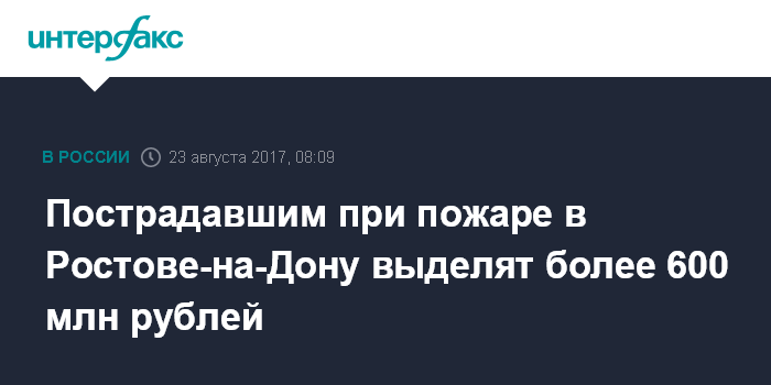 Москва. 23 августа. INTERFAX.RU - МЧС России подготовило проект распоряжения правительства об оказании финансовой помощи на 600 млн рублей пострадавшим от масштабного пожара в Ростове-на-Дону, сообщили в среду "Интерфакс" в пресс-службе МЧС России.