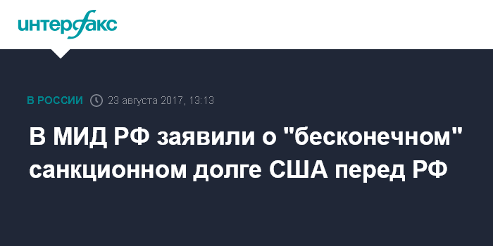 Москва. 23 августа. INTERFAX.RU - Замминистра иностранных дел РФ Сергей Рябков заявил, что Вашингтон находится в неоплатном "санкционном долгу" перед Москвой, однако Россия не будет принимать ответных мер, которые могли бы нанести вред ее интересам, а также региональной и глобальной стабильности.