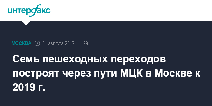 Москва. 24 августа. INTERFAX.RU - До конца следующего года планируется построить семь подземных и надземных пешеходных переходов через пути Московского центрального кольца (МЦК). Об этом сообщил журналистам в четверг заместитель мэра Москвы по вопросам градостроительной политики и строительства Марат Хуснуллин.