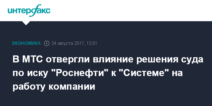 Москва. 24 августа. INTERFAX.RU - Решение суда по иску "Роснефти" к АФК "Система" не препятствует деятельности "Мобильных Телесистем" - ключевой дочки "Системы", следует из заявления МТС.