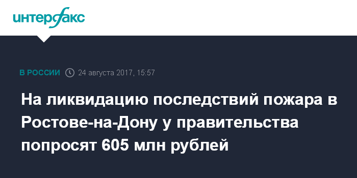 Москва. 24 августа. INTERFAX.RU - Губернатор Ростовской области Василий Голубев обратился к правительству РФ с просьбой выделить региону свыше 605 млн рублей на ликвидацию последствий крупного пожара, который произошел в центре Ростова-на-Дону 21 августа.