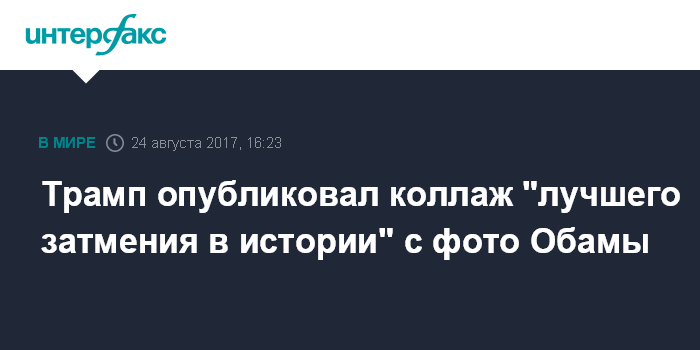 Москва. 24 августа. INTERFAX.RU - Президент США Дональд Трамп опубликовал в твиттере коллаж, показывающий, каким образом ему удалось в буквальном смысле затмить своего предшественника на посту главы государства Барака Обаму.