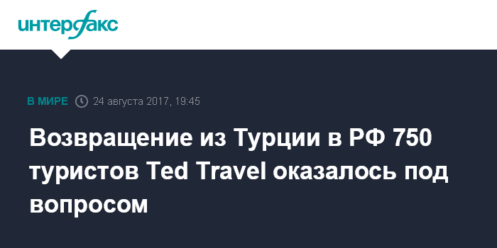 Москва. 24 августа. INTERFAX.RU - После приостановки деятельности туроператора Ted Travel под вопросом остается обратный перелет из Турции в Россиию 750 клиентов компании, сообщил "Интерфаксу" источник в туротрасли.
