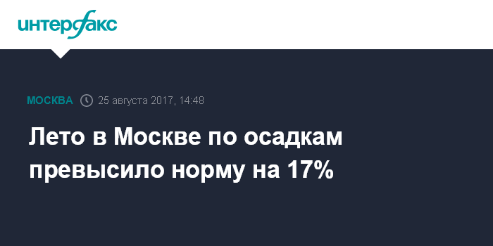Москва. 25 августа. INTERFAX.RU - С начала лета в Москве на базовой метеостанции на ВДНХ зафиксировано выпадение 288 мм дождей при норме для лета 246 мм, сообщили "Интерфаксу" в столичном метеобюро в пятницу.