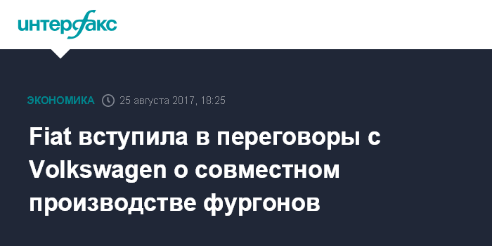 Москва. 25 августа. INTERFAX.RU - Германский автопроизводитель Volkswagen и итало-американская Fiat Chrysler Automobiles (FCA) ведут переговоры о совместном выпуске легких грузопассажирских автомобилей, сообщает MarketWatch со ссылкой на информированные источники.