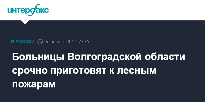 Москва. 25 августа. INTERFAX.RU - Больницы в Волгоградской области начали приводить в режим повышенной готовности из-за природных пожаров, сообщили "Интерфаксу" в администрации губернатора региона в пятницу.