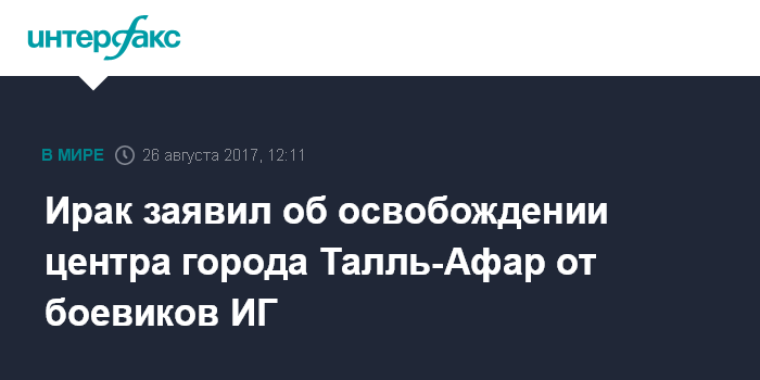 Москва. 26 августа. INTERFAX.RU - Вооруженные силы Ирака взяли под контроль центр города Талль-Афар в рамках кампании против боевиков террористической группировки "Исламское государство" (ИГ, запрещена в РФ), сообщают в субботу западные СМИ.
