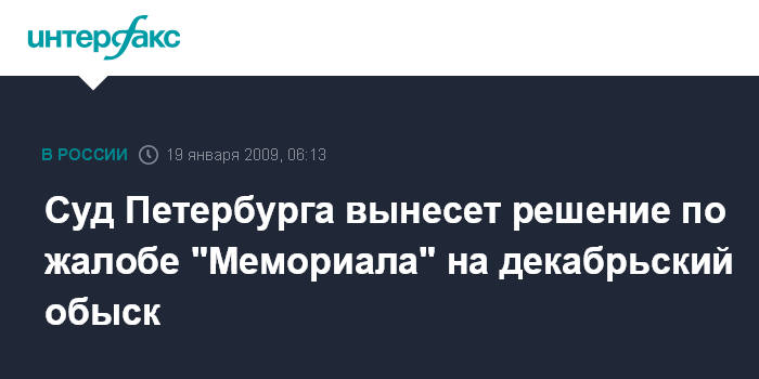 Санкт-Петербург. 19 января. ИHТЕРФАКС СЕВЕРО-ЗАПАД - Дзержинский суд Петербурга в понедельник вынесет решение по жалобе научно- информационного центра "Мемориал", поданной после обыска в офисе организации.