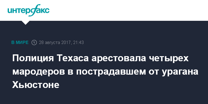 Москва. 28 августа. INTERFAX.RU - Полиция Техаса арестовала в американском Хьюстоне четырех мародеров, которые пытались ограбить дома эвакуированных из-за удара стихии горожан, сообщает в понедельник телеканал ABC News.