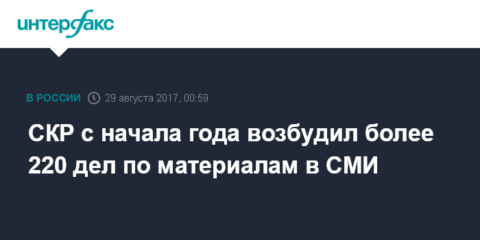 Москва. 29 августа. INTERFAX.RU - Следственный комитет России с начала года возбудил 229 уголовных дел по сигналам СМИ, рассказал председатель СКР Александр Бастрыкин в интервью "Российской газете".