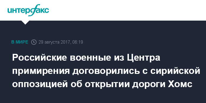 Москва. 29 августа. INTERFAX.RU - Дорога между городами Хомс и Хама в Сирии благодаря переговорам представителей российского Центра по примирению враждующих сторон (ЦПВС) с оппозицией в зоне деэскалации севернее Хомса открыта для гуманитарных конвоев, заявил начальник ЦПВС генерал-лейтенант Александр Вязников.