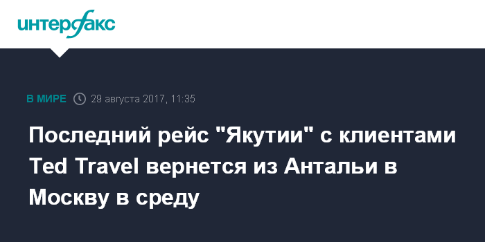 Москва. 29 августа. INTERFAX.RU - Четвертый самолет авиакомпании "Якутия" с клиентами туроператора Ted Travel прилетит из Антальи в Москву в 4 утра в среду, всего авиакомпания вывезла уже более 500 туристов приостановившего деятельность туроператора, сообщила во вторник ассоциация "Турпомощь".