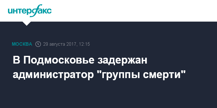 Москва. 29 августа. INTERFAX.RU - Полицейские задержали администратора "группы смерти", подозреваемого в покушении на доведение до самоубийства жителя Московской области. Об этом сообщила "Интерфаксу" во вторник официальный представитель МВД Ирина Волк.