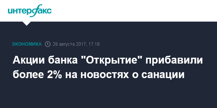 Москва. 29 августа. INTERFAX.RU - Акции банка "Открытие" вечером во вторник выросли более чем на 2% на новостях от ЦБ РФ. На Московской бирже акции банка "Открытие" к 17:03 МСК выросли на 2,3% - до 1339 рублей.
