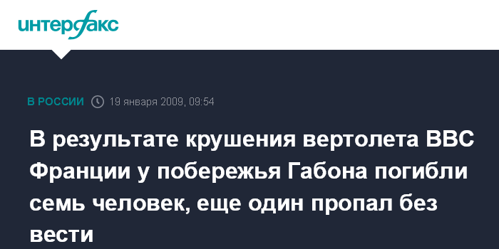 Москва. 19 января. INTERFAX.RU - В Габоне продолжается поиск последнего члена экипажа вертолета французских ВВС, который накануне потерпел аварию у побережья и упал в океан, сообщает британская телерадиокорпорация Би-Би-Си.