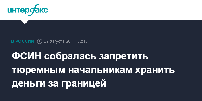 Москва. 29 августа. INTERFAX.RU - Ряду должностных лиц Федеральной службы исполнения наказаний (ФСИН) будет запрещено держать деньги в иностранных банках, в центральном аппарате службы запрет будет действовать практически для всех. Проект соответствующего приказа ФСИН размещен на федеральном портале нормативных правовых актов.
