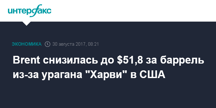 Brent снизилась до $51,8 за баррель из-за урагана "Харви" в США