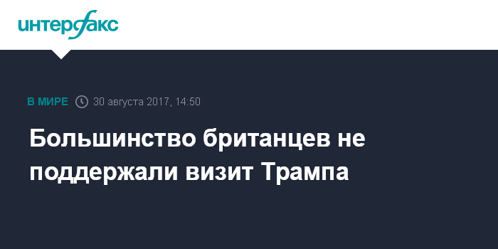 Москва. 30 августа. INTERFAX.RU - Только 13% жителей Великобритании хотели бы, чтобы президент США Дональд Трамп приехал в их страну с официальным визитом, свидетельствуют результаты опроса компании ICM, проведенного для газеты The Guardian.