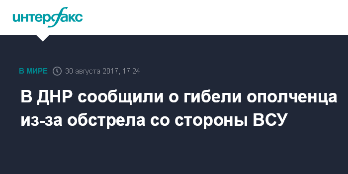 Москва. 30 августа. INTERFAX.RU - Ополченец самопровозглашенной Донецкой народной республики погиб в среду в результате обстрела со стороны Вооруженных сил Украины, сообщил журналистам заместитель командующего оперативным командованием ДНР Эдуард Басурин.