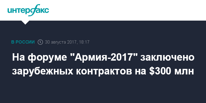 Москва. 30 августа. INTERFAX.RU - Общий объем контрактов с зарубежными партнерами, заключенных на форуме "Армия-2017", составил $300 млн. Об этом заявил директор Федеральной службы по военно-техническому сотрудничеству (ФСВТС) России Дмитрий Шугаев.