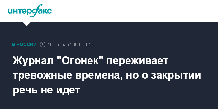 "Но я верю, что "Огонек" продолжит свой бесперебойный выход. Ведь ему уже сто десять лет, и он не прекращал выходить даже в Гражданскую войну, когда время было куда сложнее, чем сейчас. И было бы очень обидно, чтобы с таким уникальным изданием что-то случилось в год его 110-летия", - отметил В.Лошак.
