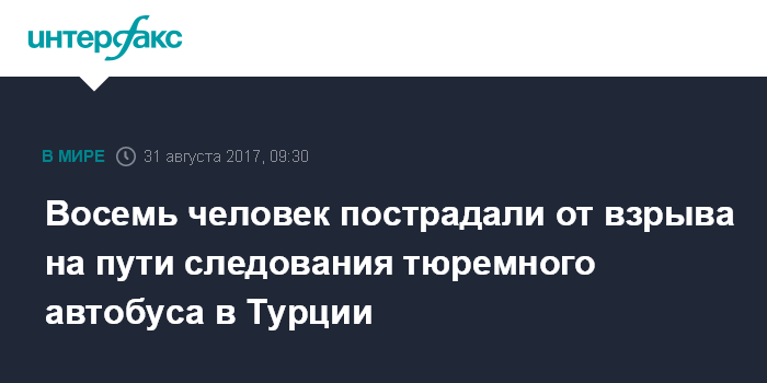Москва. 31 августа. INTERFAX.RU - Взрыв произошел в четверг на пути следования тюремного автобуса в провинции Измир на западе Турции, ранены восемь человек. Об этом сообщает издание Hurriyet.