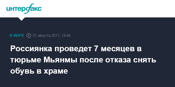 Москва. 31 августа. INTERFAX.RU - Российскую туристку арестовали в Мьянме после того, как женщина отказалась снять обувь в местном храме, сообщает на своей странице в Facebook посольство России в Мьянме.