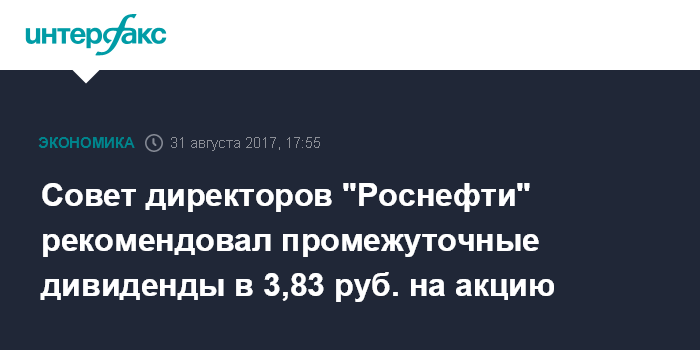 Москва. 31 августа. INTERFAX.RU - Совет директоров "Роснефти" рекомендовал внеочередному собранию акционеров выплатить дивиденды по результатам первого полугодия 2017 года в размере 3 руб. 83 коп. на акцию, говорится в сообщении компании. Лица, имеющие право на получение дивидендов, определяются на 10 октября 2017 года.