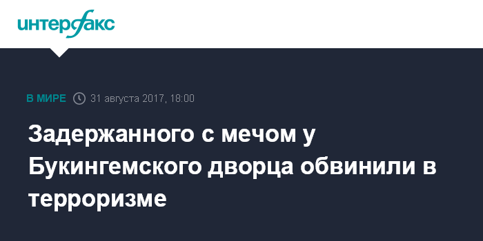 Москва. 31 августа. INTERFAX.RU - Британская полиция предъявила обвинения в участии в подготовке теракта или терактов мужчине, которого задержали на прошлой неделе возле Букингемского дворца с мечом длиной 1,2 м в автомобиле. Об этом сообщает в четверг агентство Associated Press.