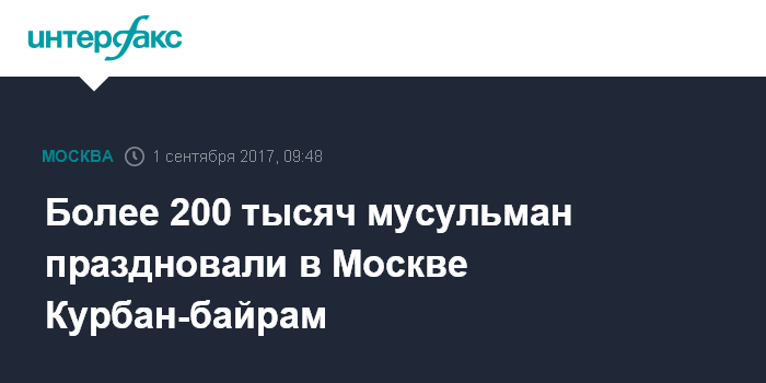 Москва. 1 сентября. INTERFAX.RU - В мероприятиях, приуроченных к празднованию Курбан-байрама в Москве, приняло участие более 200 тыс. верующих, инцидентов не зафиксировано.