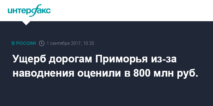 Москва. 1 сентября. INTERFAX.RU - Специалисты Росавтодора вместе с приморскими коллегами на очередном заседании комиссии по ЧС озвучили предварительную сумму ущерба дорожной инфраструктуре Приморского края, пострадавшего от наводнения в начале августа.