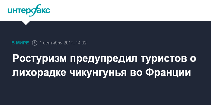 Москва. 1 сентября. INTERFAX.RU - Ростуризм призвал россиян при поездках во Францию учитывать "ухудшение эпидемиологической обстановки" в связи со случаями заболеваемости лихорадкой чикунгунья, сообщается в пятницу на сайте ведомства.