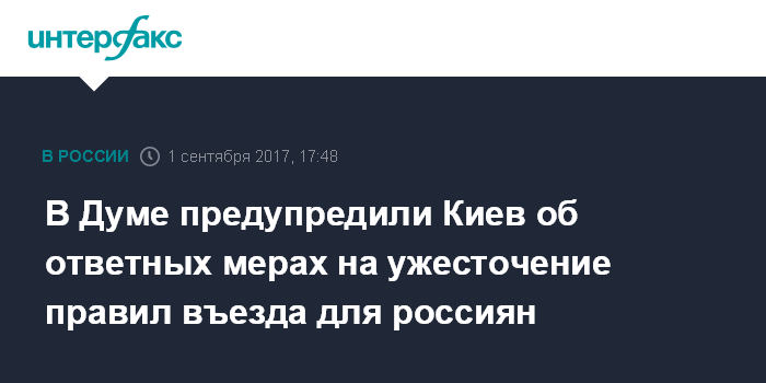 Москва. 1 сентября. INTERFAX.RU - Россия в качестве ответной меры введет для граждан Украины обязанность заблаговременного информирования о прибытии в РФ, если Киев реализует эту уже объявленную им меру в отношении россиян, заявил глава комитета Госдумы по делам СНГ, евразийской интеграции и связям с соотечественниками Леонид Калашников.
